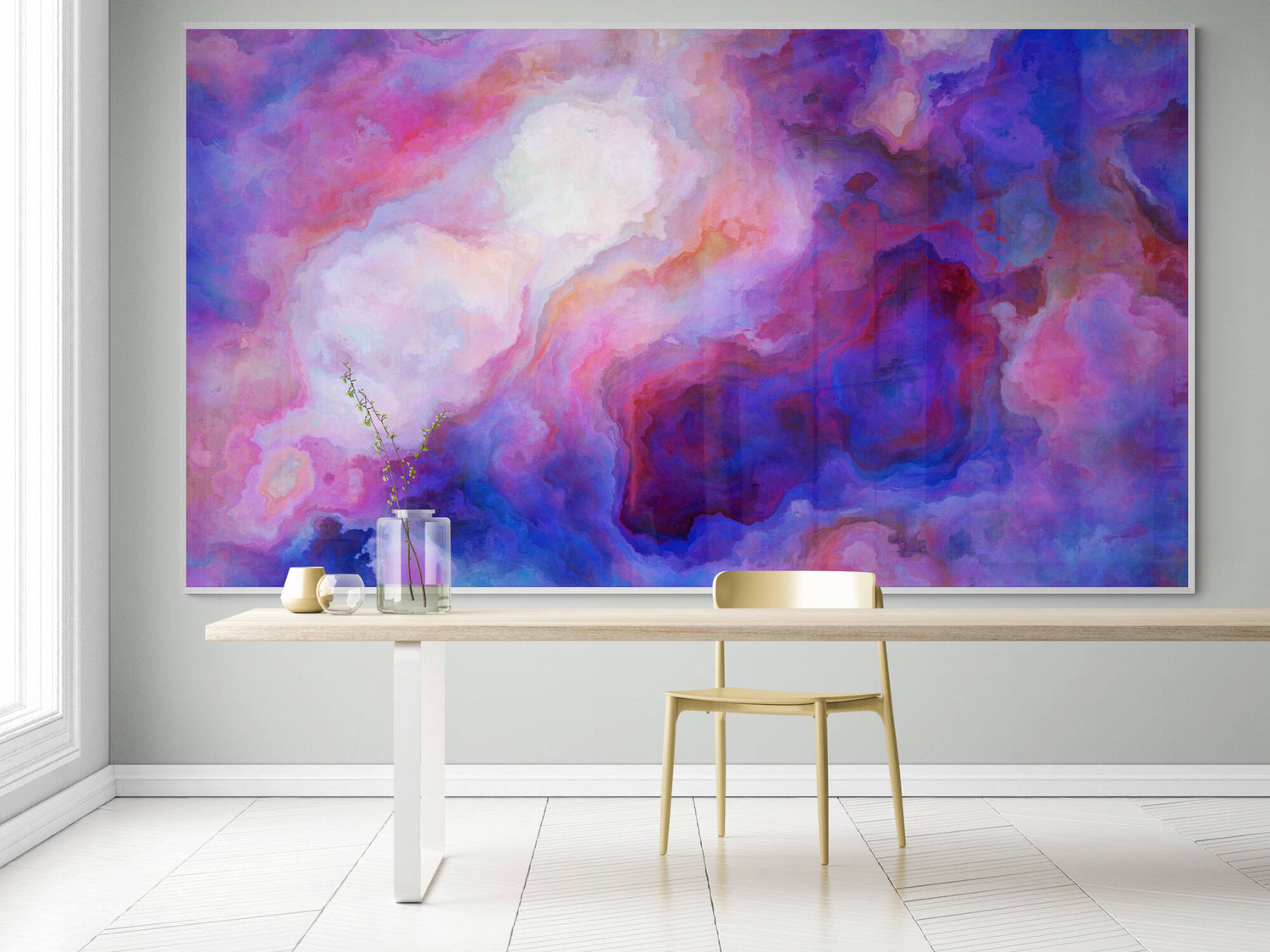 The art is printed on an ultra-HD Fuji Crystal Professional Archive Maxima Paper (1) with an aluminum Dibond substrate (2) and face mounted to a piece of 1/4" shatterproof acrylic glass (3) (the larger and mural options use 1/8" glass for a lighter weight). For easy mounting, there are gallery quality aluminum rails attached to the back so your art will arrive ready to hang. The piece sits out from the wall by about 0.75" (or 101.6cm x 76.2cm x 1.9cm). It weighs approximately 10kg/m^2.
