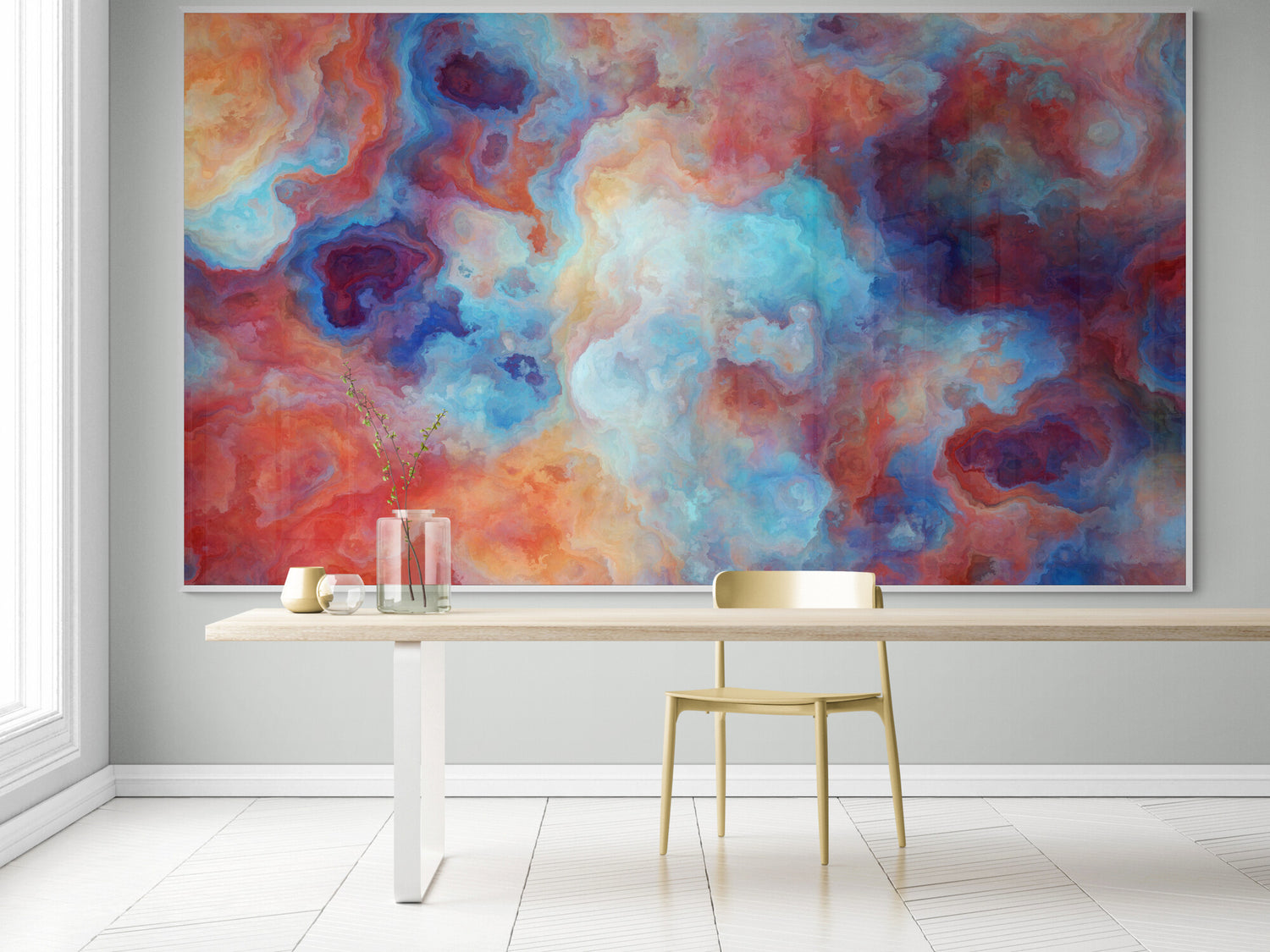 The art is printed on an ultra-HD Fuji Crystal Professional Archive Maxima Paper (1) with an aluminum Dibond substrate (2) and face mounted to a piece of 1/4" shatterproof acrylic glass (3) (the larger and mural options use 1/8" glass for a lighter weight). For easy mounting, there are gallery quality aluminum rails attached to the back so your art will arrive ready to hang. The piece sits out from the wall by about 0.75" (or 101.6cm x 76.2cm x 1.9cm). It weighs approximately 10kg/m^2.