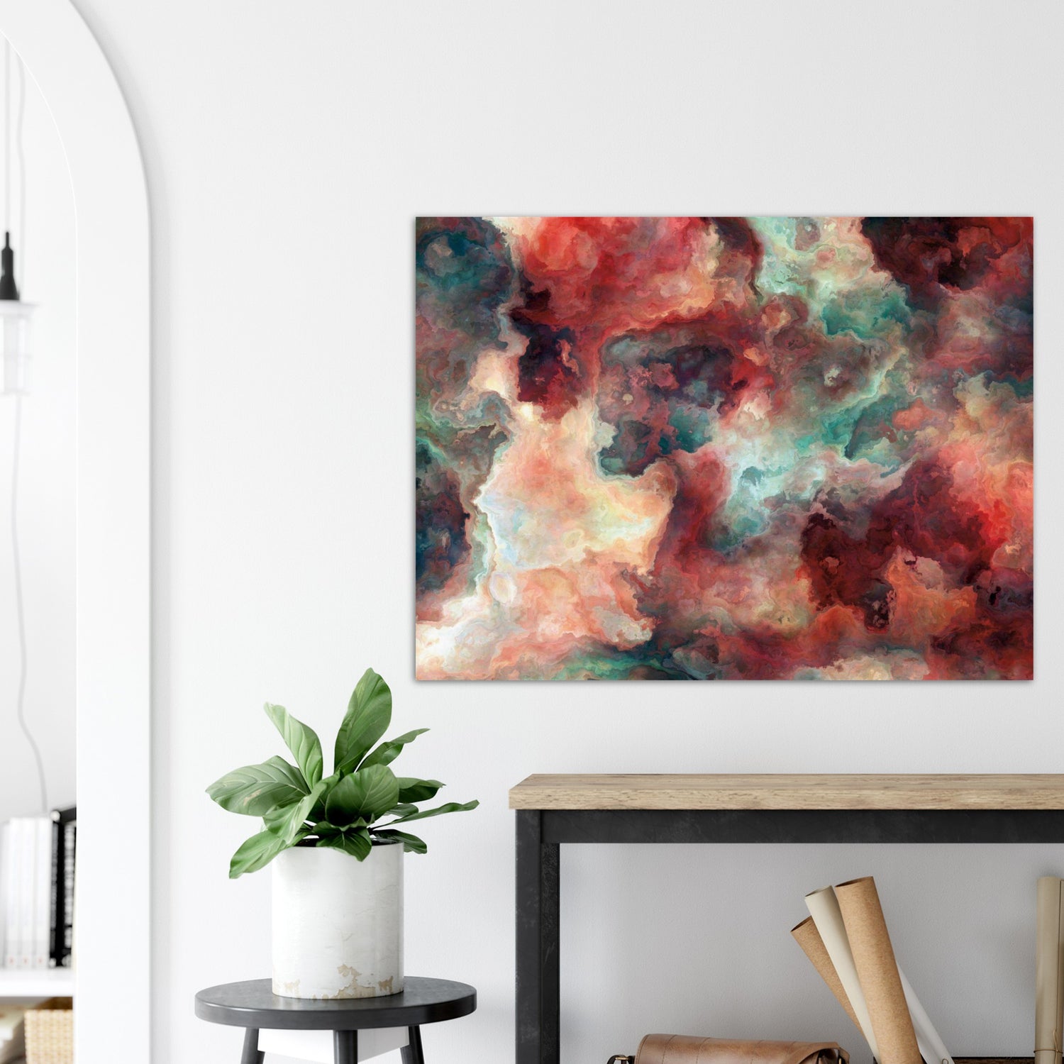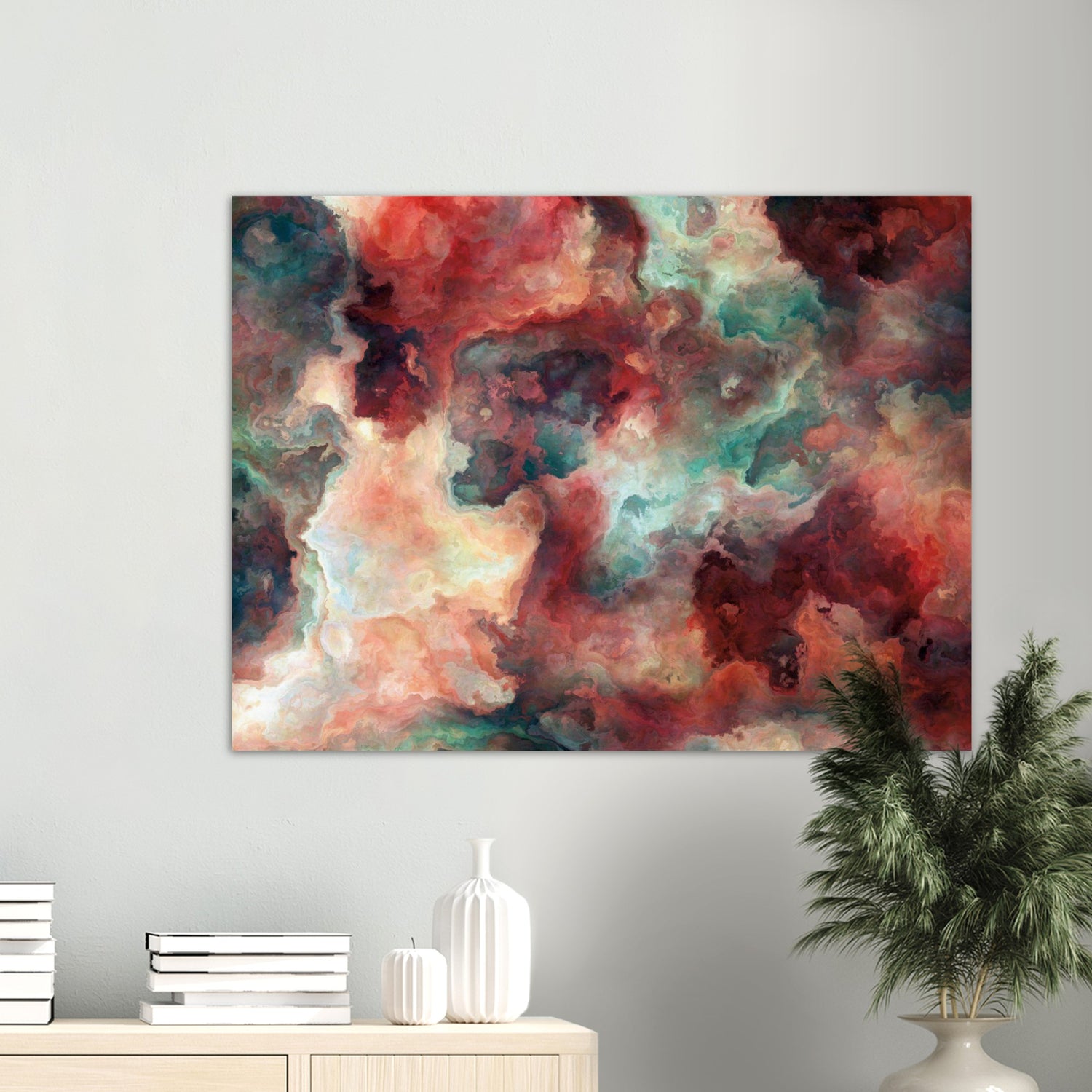 A wild piece featuring calming reds and invigorating blue highlights. Based on my fine art piece, where you can commission custom art in this style printed on metal or under glass here.
