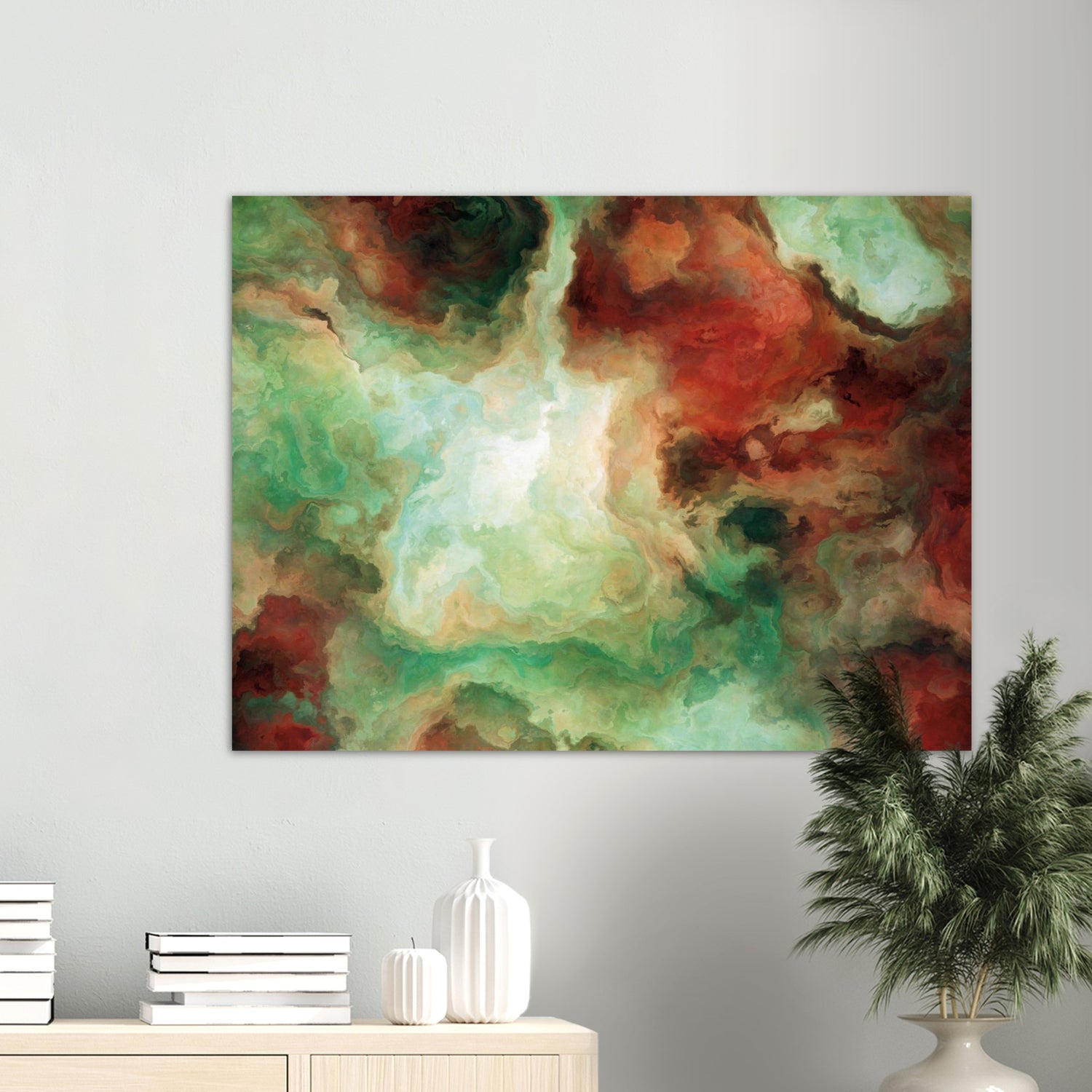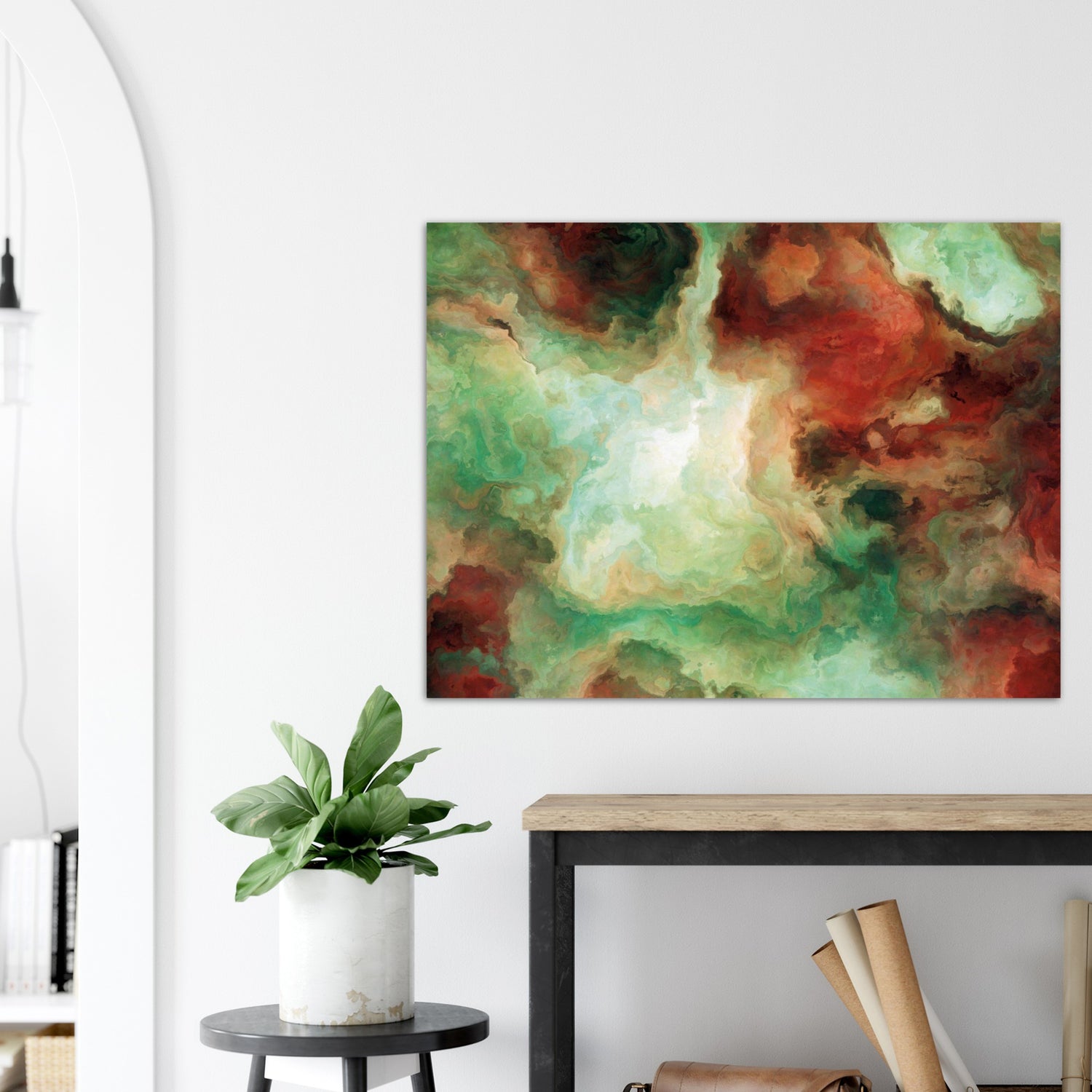 A deep and thought-provoking piece with muted reds and greens. Based on my fine art piece, where you can commission custom art in this style printed on metal or glass here.
